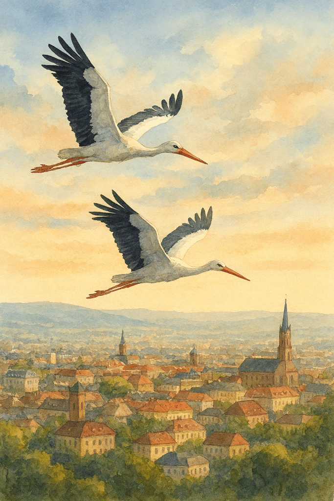 Et les Cigognes ? Elles survolent sans effort ces villes magnifiques, glissant entre les clochers et les toits, sans le moindre accrochage, sans GPS affolé. Elles gardent une belle vue sur nous, les voyageurs terrestres, comme des anges à longues pattes, veillant sur notre lente procession.