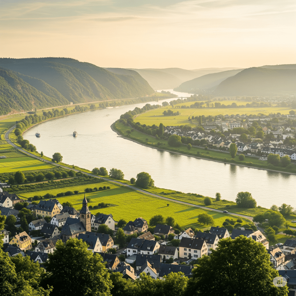 Mirages et rives du Neckar : Le ciel, lavé par la lumière du soir, se pare de teintes cuivrées et lavande.