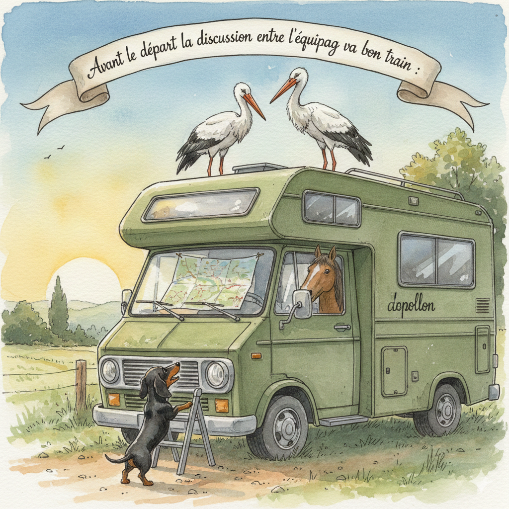 Cigai lui donna un petit coup de bec affectueux, comme pour sceller la fin de l’épisode. Madame Klara remonta dans le motor‑home. Monsieur Génie vérifia une dernière fois les sangles, les portes d’armoires et les tiroirs pour s’assurer qu’ils étaient bien verrouillés. Apollon, fier comme un capitaine de navire, sauta à bord d’un bond déterminé. Le voyage pouvait continuer. Le temps de prendre notre repas, et déjà nous poursuivions la route vers Falkenberg